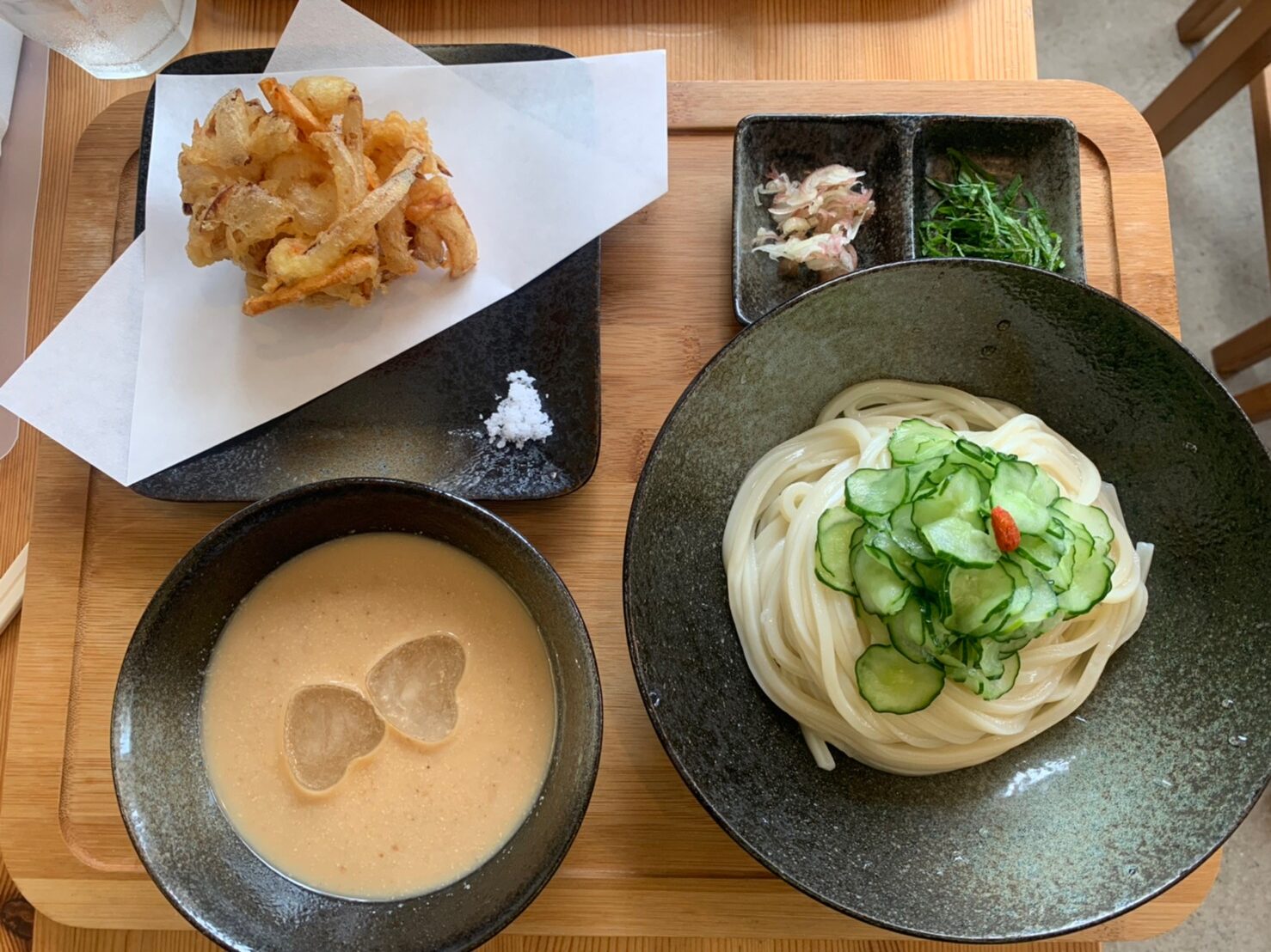 うどんも冷水で〆ていてのど越しが良くキュウリとゴマのさっぱり感とともに無限に食べれてしまう